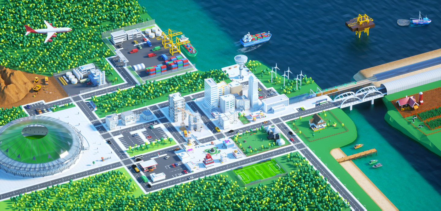 The public is invited to discover a fictitious city in 3D illustration, a detail that brings a touch of seriousness in order to contrast with a playful universe made up of simple shapes, soft colors and natural light.