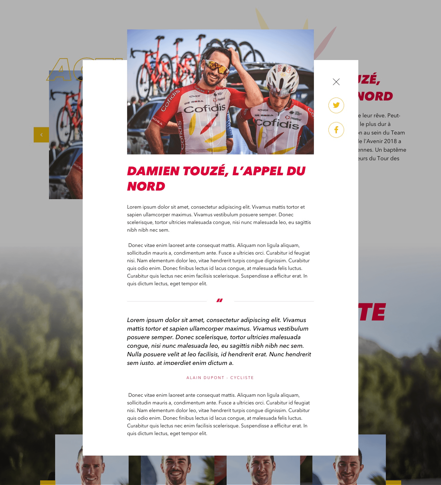 The website places the user as a guide for the Cofidis team. To exacerbate this intimacy, we wanted to place spectators as close as possible to the runners and their daily lives.