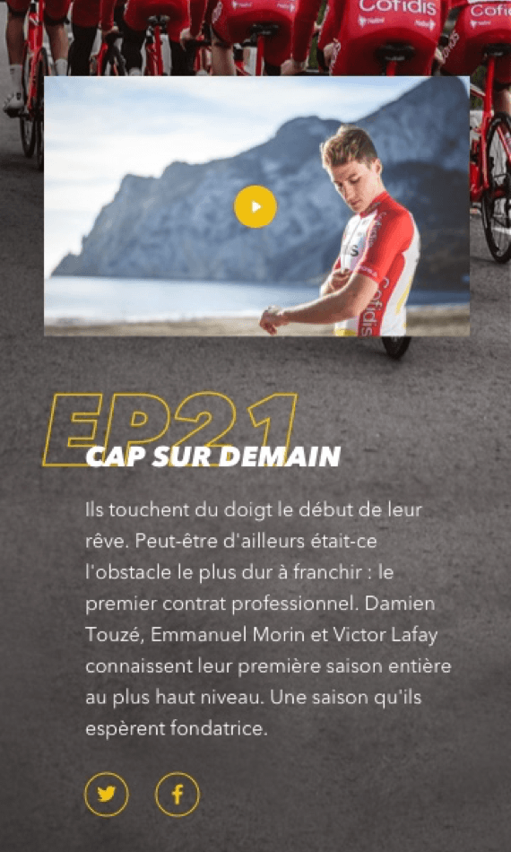 For the 5th season, the Cofidis team is renewing a webserie in partnership with France Télévision. To highlight this dive into the heart of the Tour de France, the brand asks us to design a digital packaging to match.