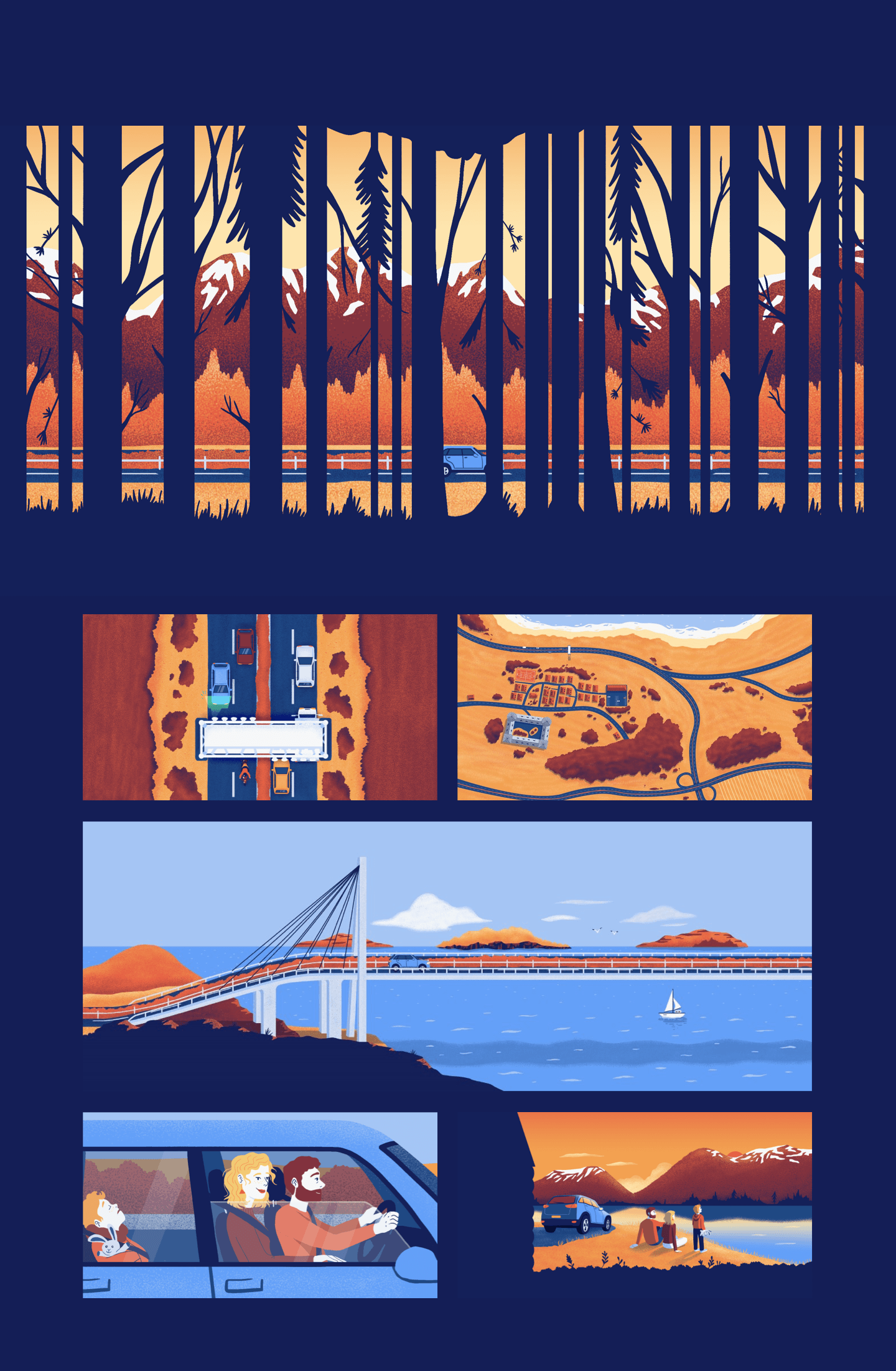 Inspiring, playful and captivating: the experience created simulates a peaceful journey on the motorways of France. Games of perspectives, evolving scenery and animations lead us to browse the page as a child would watch the landscapes scroll by from the back seat. The pastel and warm tones enhance this feeling of travel and take us into a world that reflects the service it highlights: simple, accessible and modern.