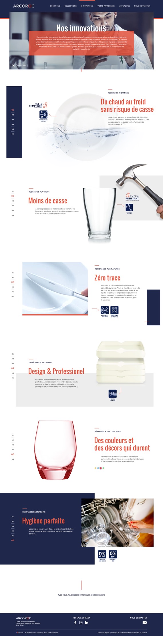Nous avons proposé de repenser l’identité digitale de la marque en repensant le site internet autour d’une nouvelle signature “ everyday proof”, qui vient affirmer l’ambition d’Arcoroc : une vaisselle à l’épreuve du quotidien pour les restaurateurs et consommateurs. L’histoire du site s’écrit autour de ces objets uniques qui incarnent l’excellence et la durabilité.