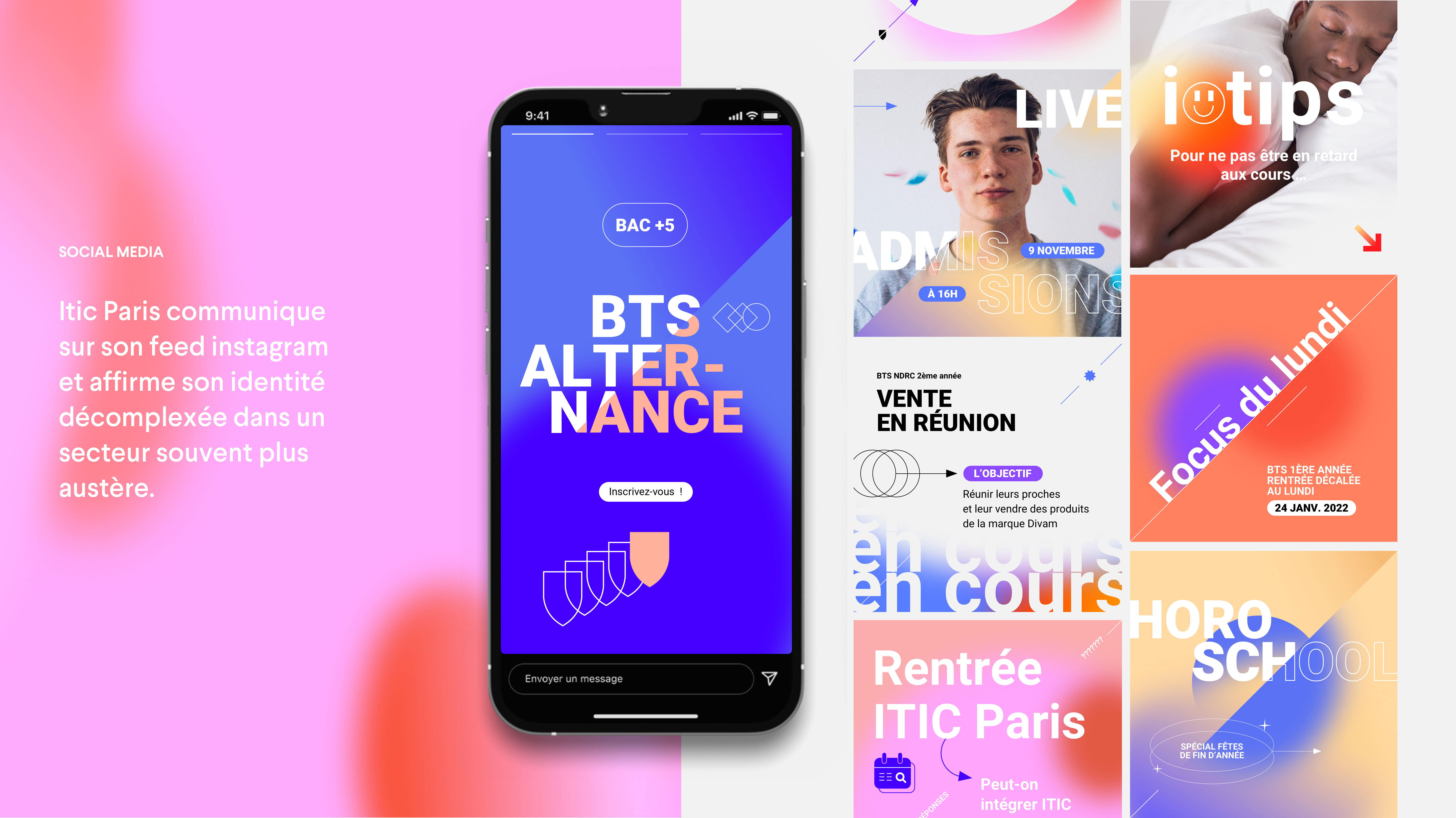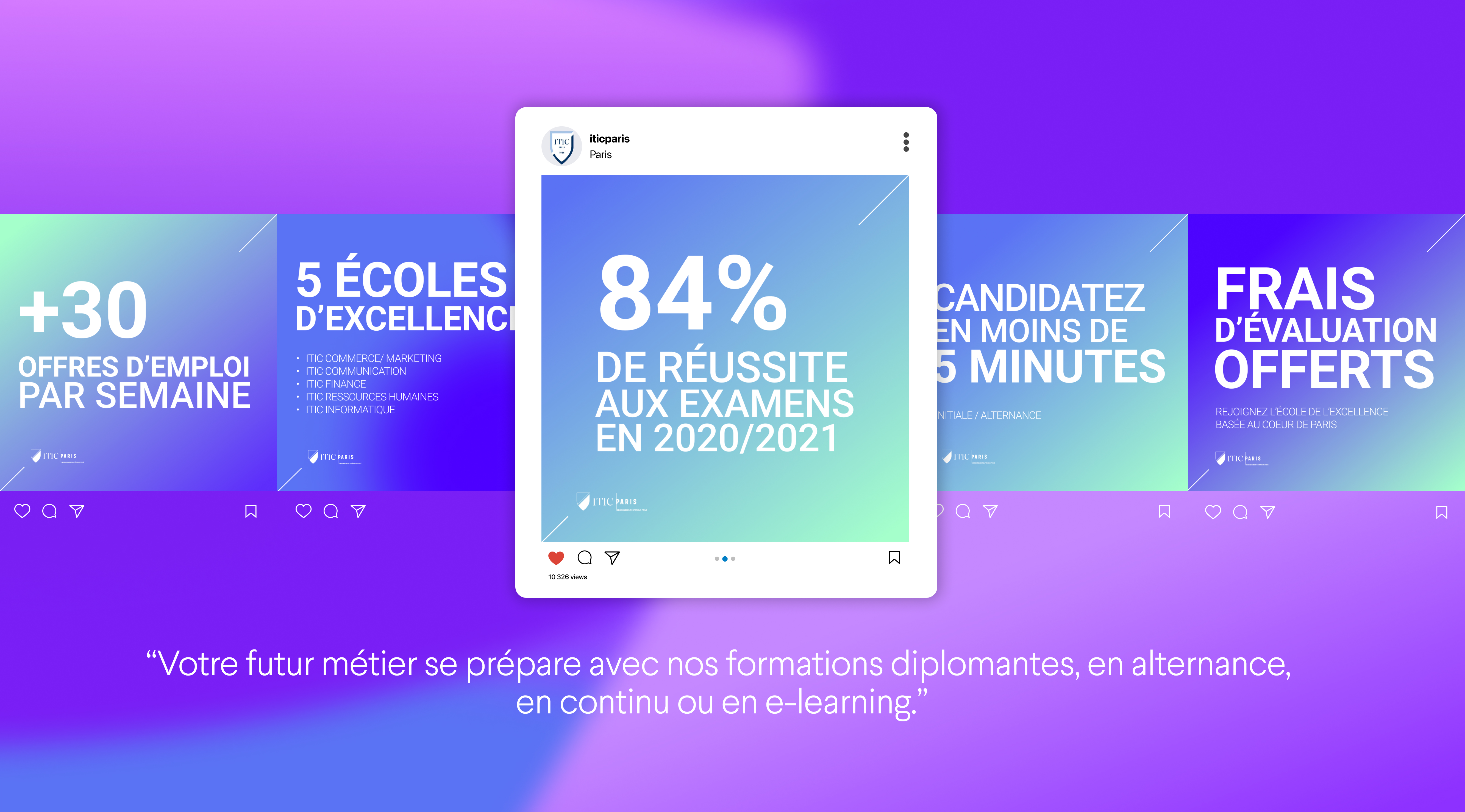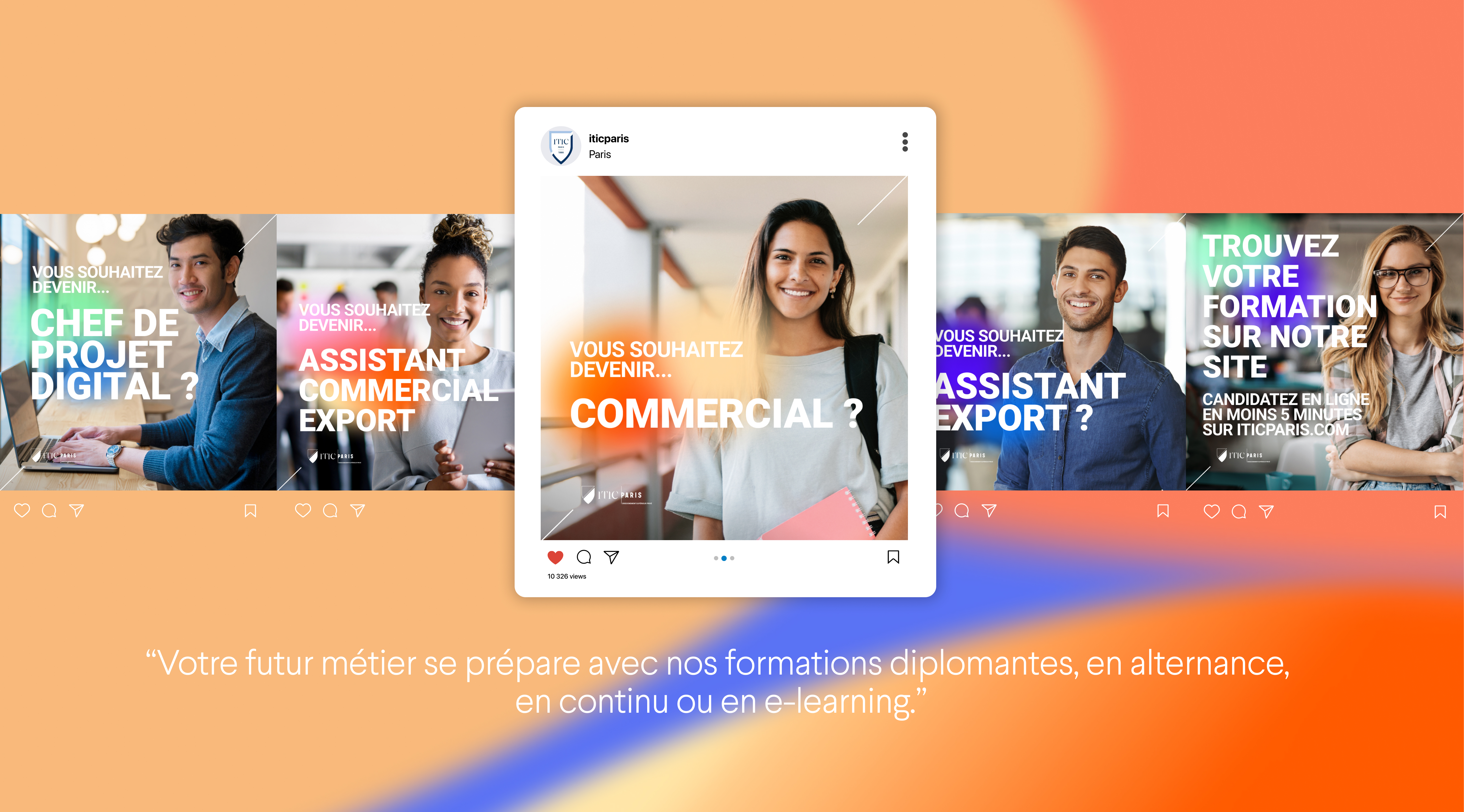 Pour assurer le déploiement de la nouvelle plateforme de marque sans perdre de vue le fond, nous avons coordonné les prises de paroles d’Itic Paris autour des réelles attentes de la Gen Z : trouver sa voie, se projeter dans la vie étudiante, profiter de sa nouvelle vie, et s’épanouir.