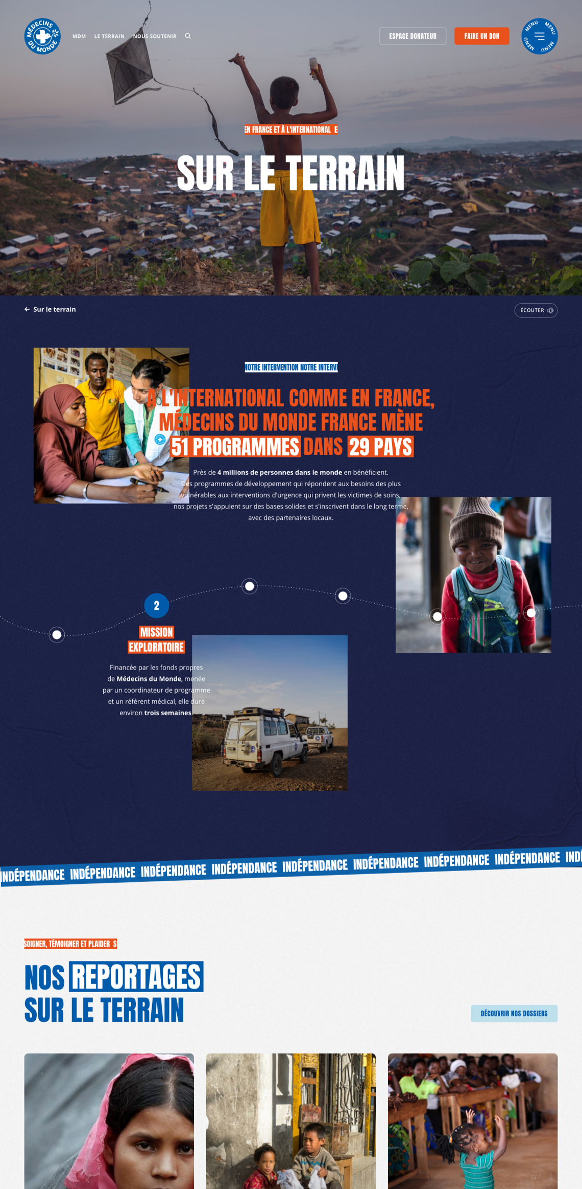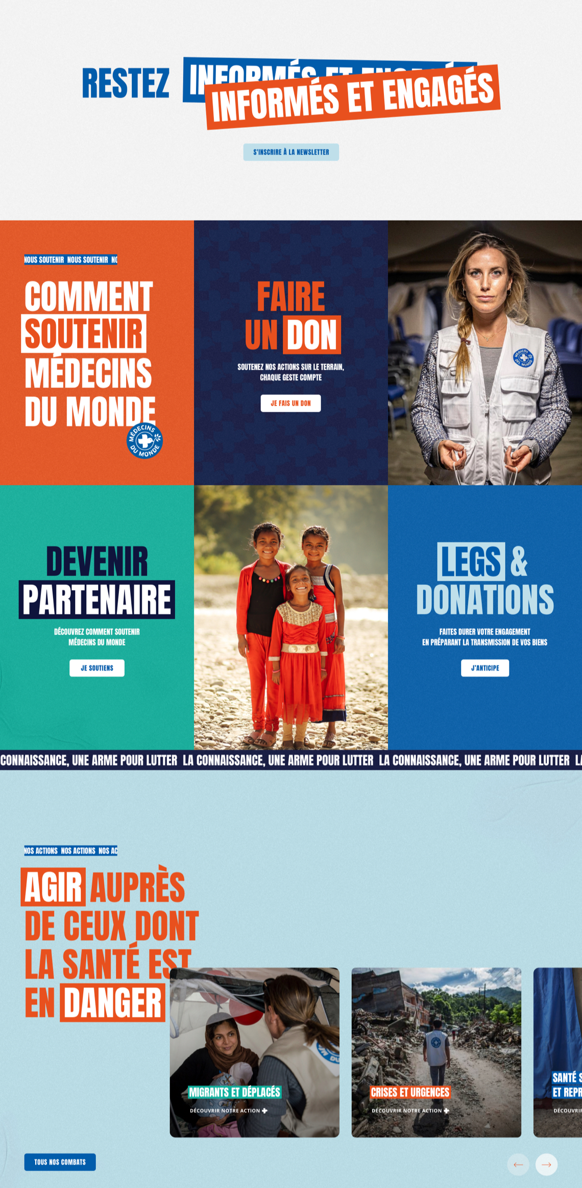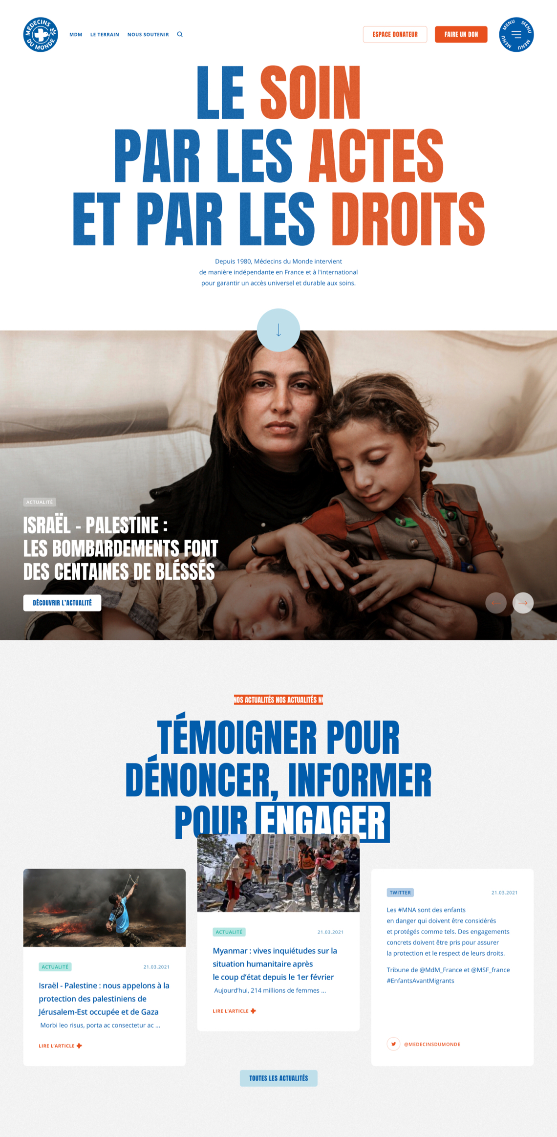Ergonomie, discours et graphisme, trois piliers pour incarner les valeurs de transparence, d’indépendance et de militance de l’association. Un trio sur lequel miser pour créer un site à l’identité forte et pionnière, à l’image de Médecins du Monde. Un site qui s’affirme et s’affiche sans demi-teinte, ni demi-mesure. Un site qui évoque l’urgence autant que les actions de long terme.