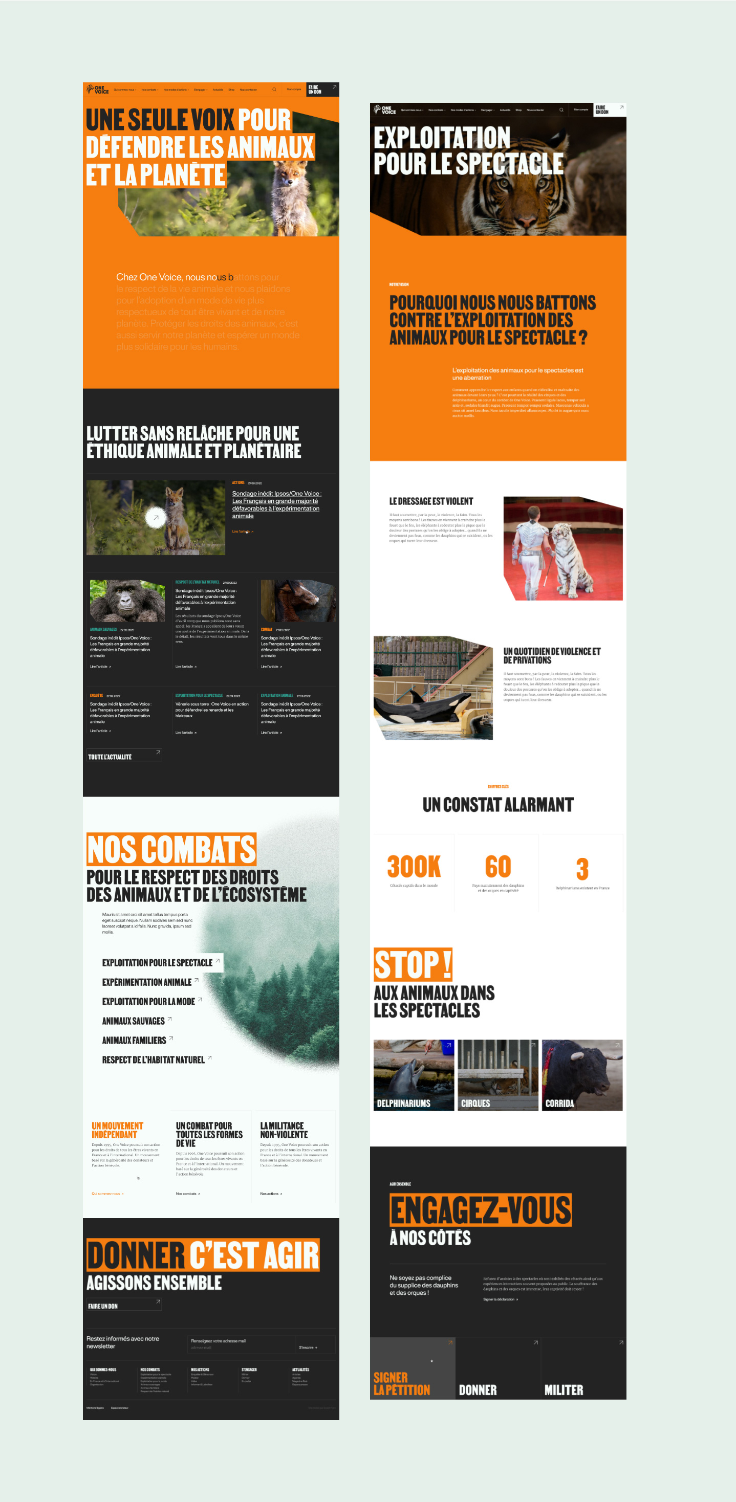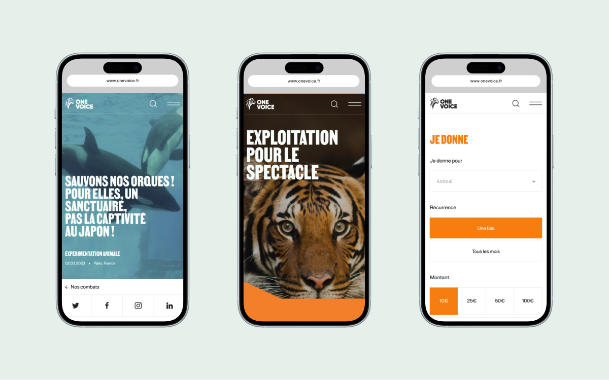 OneVoice unit aussi bien les êtres humains, en incitant à l’action, et les animaux, en prenant la parole à leur place. La symbolique du rassemblement est donc le fil rouge du site. Des jeux d’animations autour du cercle, symbole d’unicité, donnent du rythme à la navigation. Le caractère militant s’exprime à la fois dans les mots, mais également dans les visuels avec un principe de “bruit” qui vient rappeler le rassemblement, le regroupement d’individus engagés.