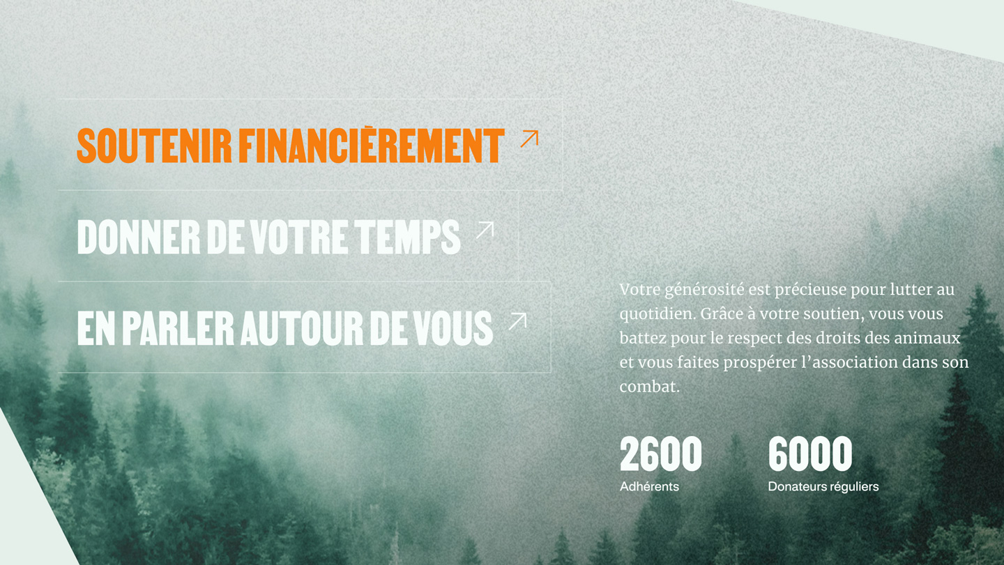 Son combat ne continue que grâce aux actions et aux donations de ses membres. Le nouveau site de la marque doit donc permettre de valoriser ces combats, pour montrer l’impact réel des dons, mais également recruter de nouveaux membres et donateurs.