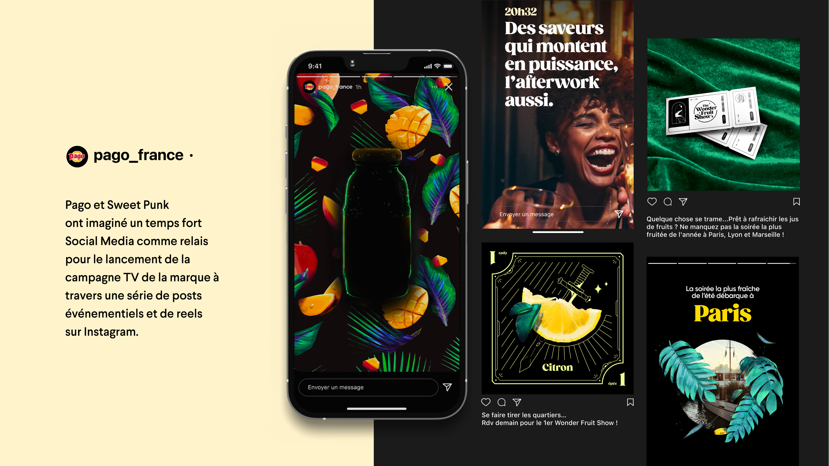 Enfin, Pago et son agence événementielle We Are Young se sont pleinement emparés du territoire graphique pensé par SweetPunk pour produire 3 événements aux couleurs de la campagne: les “Wonderfruit Show” à Paris, Lyon et Marseille sur toute la durée du mois de Juin.