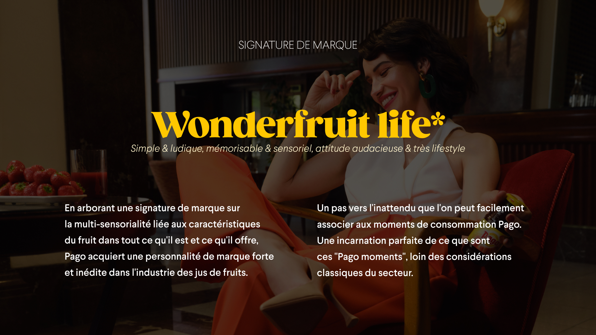 Une nouvelle signature, Wonderfruit Life, incarne la mentalité de marque : plus jeune, plus fraîche mais toujours iconique et iconoclaste. C’est une invitation à bousculer l’ordre établi – au sein des jus de fruits mais aussi dans la vie en général – Pago devient la boisson de ceux qui osent, qui écoutent leurs sens et prennent les tables pour des pistes de danse.