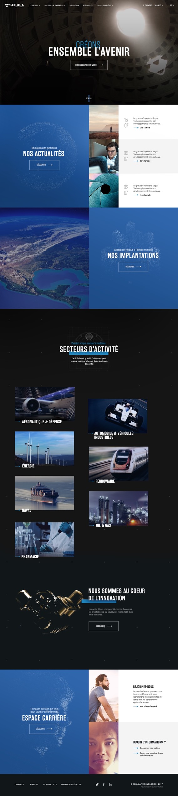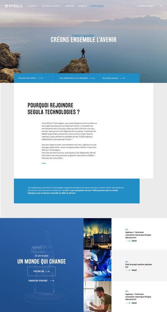 Le groupe Segula touchant de multiples profils, nous adoptons un discours global tout en proposant du contenu exclusif. Nous proposons une plateforme séduisante, ainsi qu’une version internationale, pour faciliter le recrutement des futurs collaborateurs.