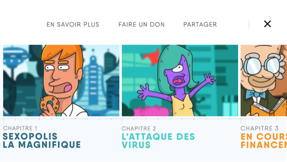 « Panique à Sexopolis » est une unique image panoramique, assez longue pour contenir 10 chapitres et un épilogue. Son histoire se révèle centimètre par centimètre à mesure que les dons apparaissent, et son humour décalé et sans complexe accroche dès les premières images.