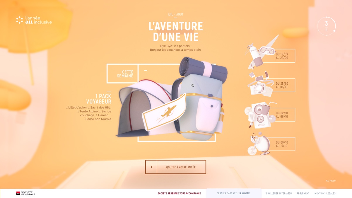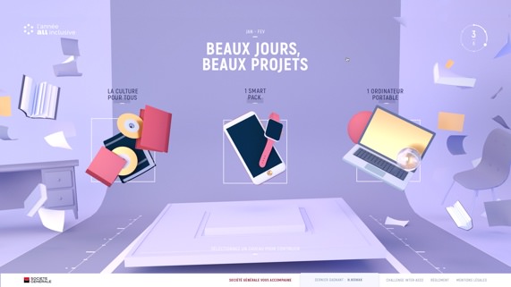 La Box All-Inclusive propose aux étudiants de composer une année sur-mesure, à l’image de leurs besoins. Avec plus d’une cinquantaine de dotations possibles, l’utilisateur est invité au sein d’un univers full 3D pour remplir sa Box personnalisée, façon Tetris, avec les solutions les plus appropriées à sa vie étudiante.