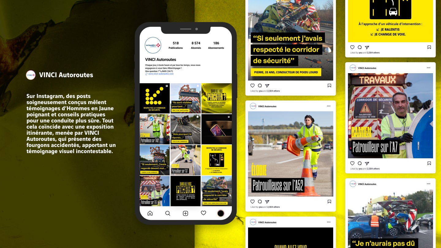 Sur Instagram, des posts soigneusement conçus mêlent témoignages d’Hommes en Jaune poignants et conseils pratiques pour une conduite plus sûre. Tout cela coïncide avec une exposition itinérante, menée par VINCI Autoroutes, qui présente des fourgons accidentés, apportant un témoignage visuel incontestable.
